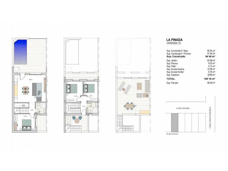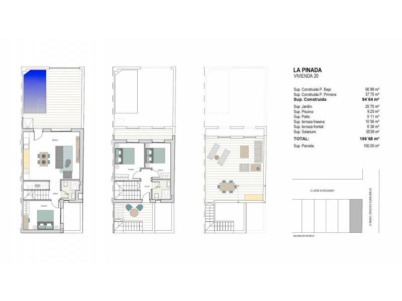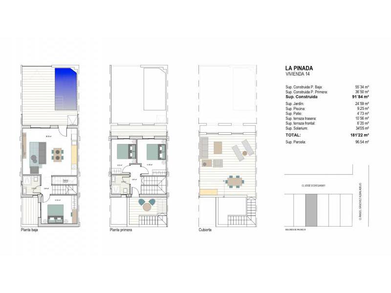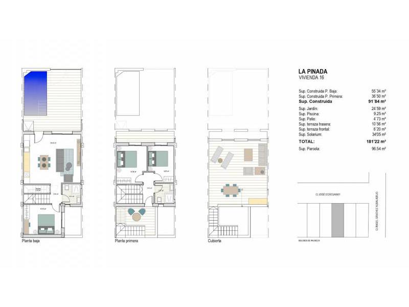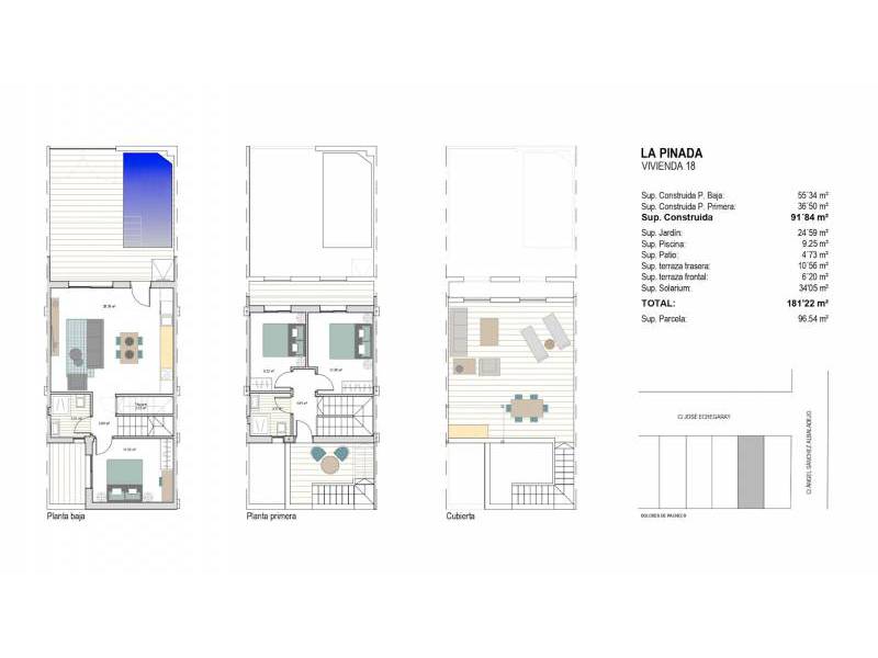 Chaque résidence offre un design soigneusement planifié avec 3 chambres, 2 salles de bains, une rafraîchissante piscine privée et un parking sur la parcelle. De plus, profitez de terrasses avant et arrière, ainsi que d'un solarium avec une cuisine d'été pour savourer le climat méditerranéen. Découvrez votre nouveau chez-vous dans ce charmant enclave !